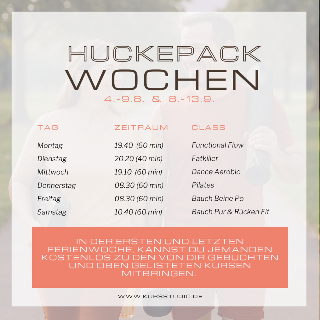Die Kurse können nur als Ganzes gebucht werden. Wenn du beispielsweiße einen 5-er Kurs Step Aerobic buchst, finden die Termine an den darauffolgenden Mittwochen für 5 Wochen hintereinander statt.